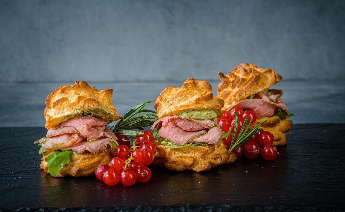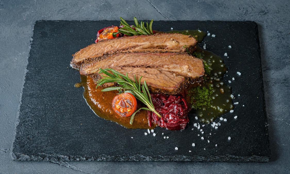 Тонко нарезанная ветчина тает на языке, раскрываясь мягкой солоноватой сладостью и тёплым ароматом специй. Плотный ростбиф с рубиновым срезом дышит сочностью, а лёгкая перечная корочка добавляет характер и глубину.